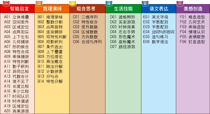 全系统长程规劃教学,超学科、跨领域,「59 项子目录」科学排序的学习內容,「450盒脑力开发」统合式的完全操作。