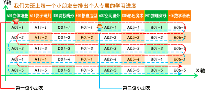 第一阶段为59项子目录单向排序(纵轴),第二阶段为螺旋式二度排序(横轴)。更藉由精心设计的学习进度手册,让教师在上课时完全掌握个别进度,不会发生重复学习或进度重叠的状况。